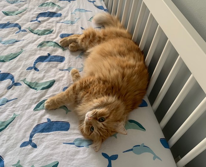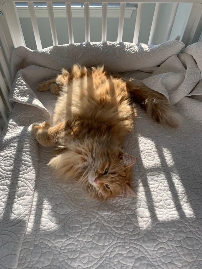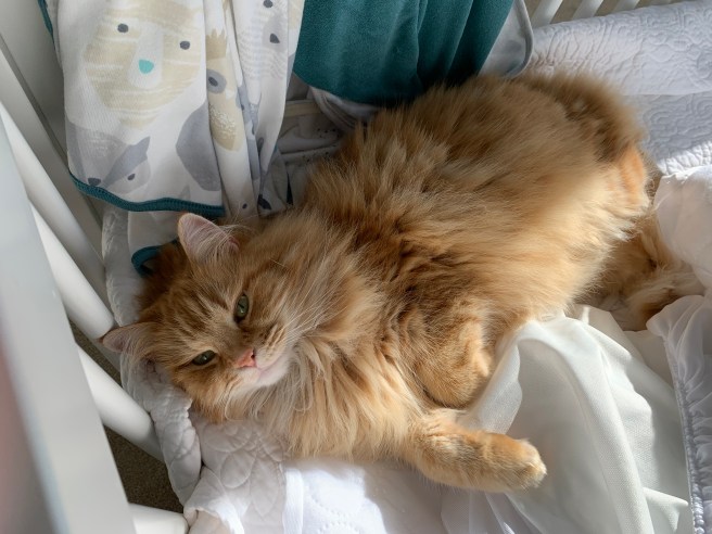 We consider her our fur baby, as so many pet owners do. Sometimes this is bittersweet to think about, especially since she has somewhat claimed areas that were meant for Luke. While we were pregnant, we kept her out of his areas since we didn’t want to promote bad habits. Now, I gave up and let her have free rein of his nursery and even his crib. I’m just happy one of our babies can enjoy and use it, I guess.